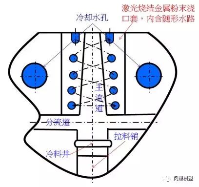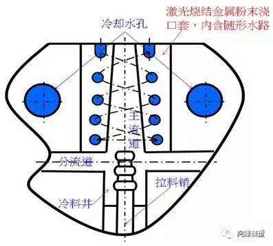 设计二(见下图)的浇口套是以激光烧结金属粉末而成的,内含随形水路。