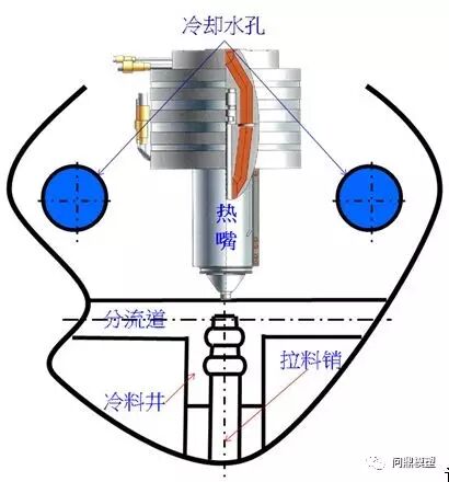 设计三的冷却时间虽已大为改善,但是,山外有山,人外有人 ---下图的设计四是以热流道的热嘴取代冷流道的主流道,热嘴的灌口直逼分流道,这么一来,设计三中拉料销上头仍然厚实的塑胶部分也消失了,需要冷却的最厚塑胶只剩下较细的分流道部分,所以,冷却时间的进一步缩短自在料中。